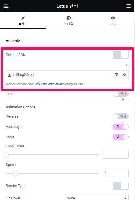 이제 다운받은 파일을 워드프레스의 엘레멘토키트의 lottie 를 선택해서 올리면 된다.